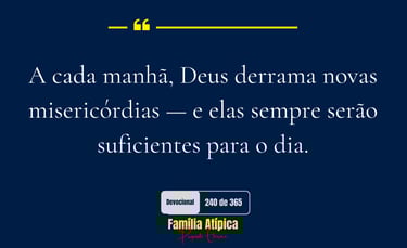 A vida da família atípica exige recomeços constantes. Cada manhã traz novos desafios, novas demandas, novas lutas. O que deu certo ontem pode não funcionar hoje, e isso pode gerar frustração e desânimo. Mas a promessa do Senhor é clara: Sua misericórdia não se esgota e se renova a cada dia.